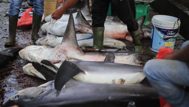 Pedagang bersiap memotong sirip ikan hiu di pelabuhan Perikanan Samudera (PPS) Lampulo , Banda Aceh, Aceh, Sabtu (18/4/2026). Data Badan…