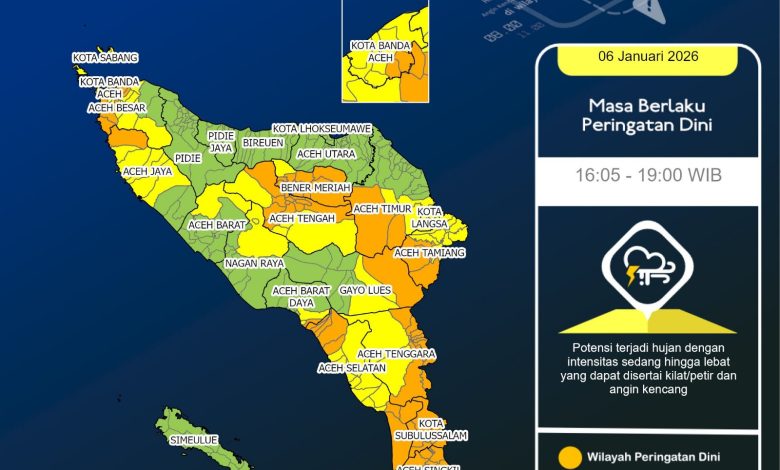 Banda Aceh (Aentenews) – Hujan sedang hingga lebat yang berpotensi disertai kilat, petir, dan angin kencang diperkirakan melanda sejumlah wilayah di Aceh hingga Selasa (6/1) malam ini.