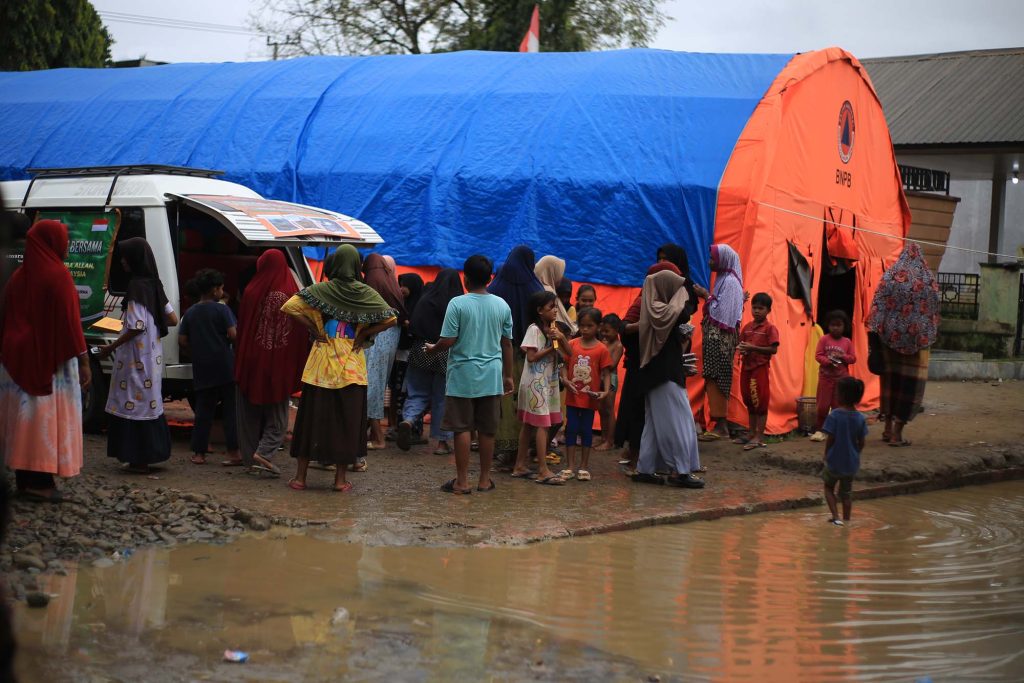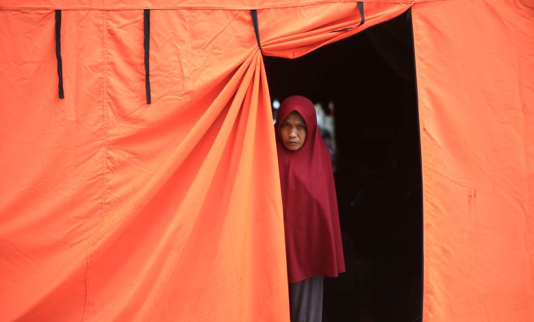 Pengungsi korban bencana banjir berdiri di pintu tenda darurat desa Meunasah Raya, kabupaten Pidie Aceh, Aceh, Selasa (17/2/2026). Puluhan KK pengungsi korban bencana di daerah itu larut dalam suasana kesedian menyambut tradisi Meugang Ramadhan 1447 Hijriyah, karena masih menempati tenda darurat sehubungan hunian sementara (Huntara) belum tuntas dikerjakan. Aentenews Foto/Ampelsa.
