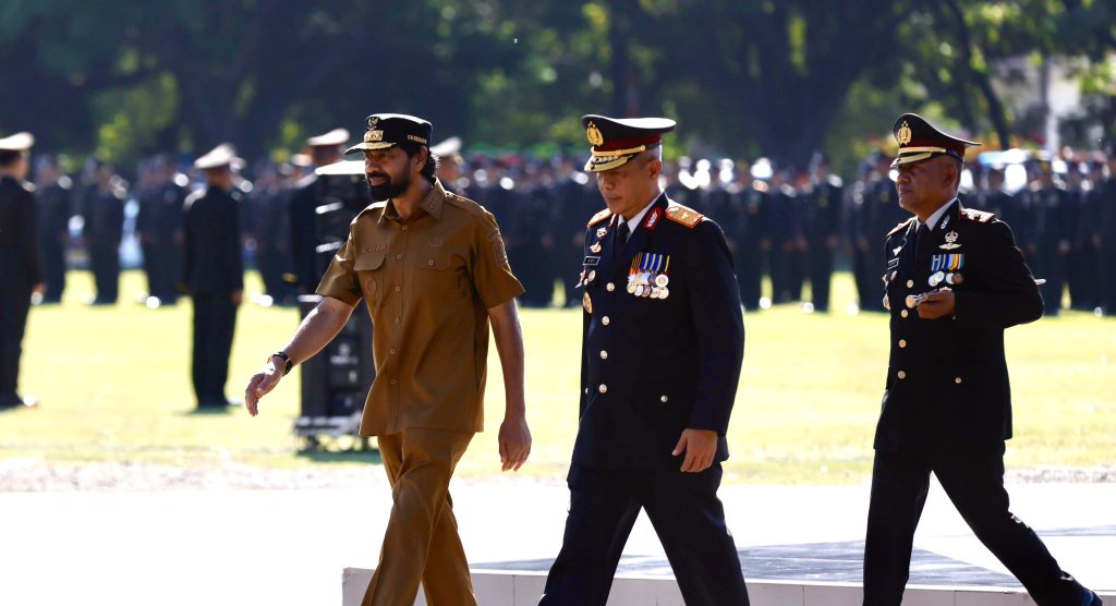 Banda Aceh – Gubernur Aceh, Muzakir Manaf atau Muallem, bertindak sebagai Inspektur Upacara pada peringatan Hari Ulang Tahun (HUT) ke-79 Bhayangkara yang digelar di Lapangan Blang Padang, Banda Aceh, Selasa (1/7).