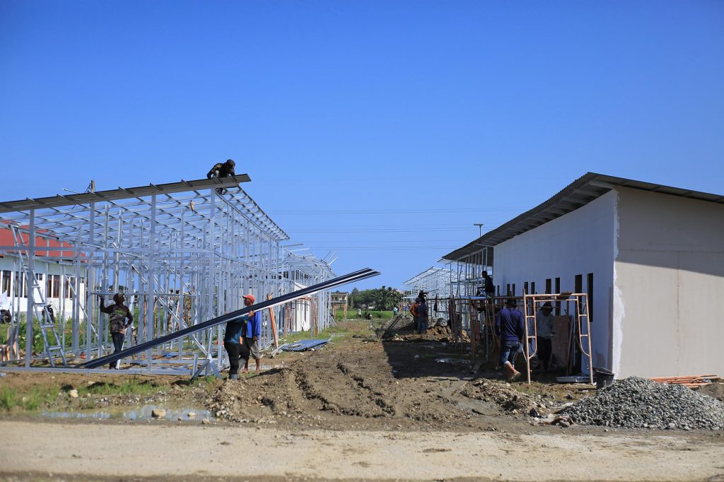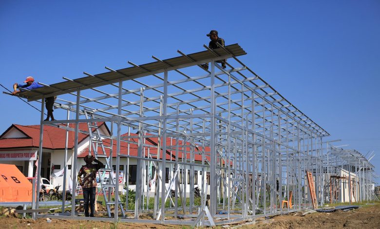 Pidie Jaya (Aentenews) – Pekerja menyelesaikan fasilitas Hunian Sementara (Huntara) untuk warga terdampak bencana banjir bandang dan longsor di kabupaten Pidie, Jaya, Aceh, Senin (5/1/2025). Di provinsi Aceh tercatat sebanyak 38.169 unit rumah rusak berat akibat bencana alam banjir dan pemerintah saat ini membangun sebanyak 28.236 unit Huntara untuk warga terdampak bencana , sedangkan 9.996 unit lainnya mendapat Dana Tunggu Hunian (DTH) sebagai solusi sementara bagi masyarakat yang terdampak. FOTO/Ampelsa.