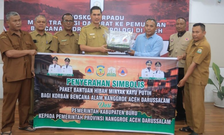 Bantuan minyak kayu putih berukuran 100ml tersebut diserahkan secara simbolis oleh Kepala Pelaksana (Kalak) BPBD Kabupaten Pulau Buru, M TH Al Affandy, dan diterima Sekretaris Daerah (Sekda) Aceh, M. Nasir, di Posko Komando Pemulihan Bencana Pemerintah Aceh, Selasa (21/4).