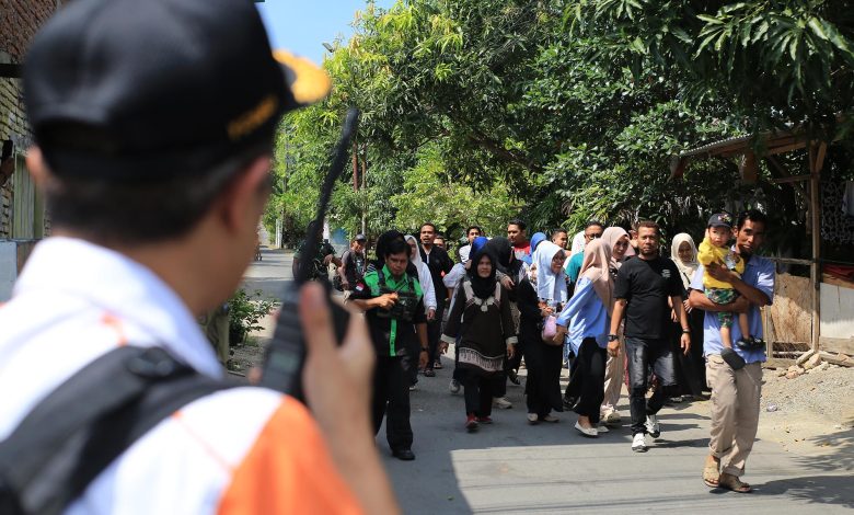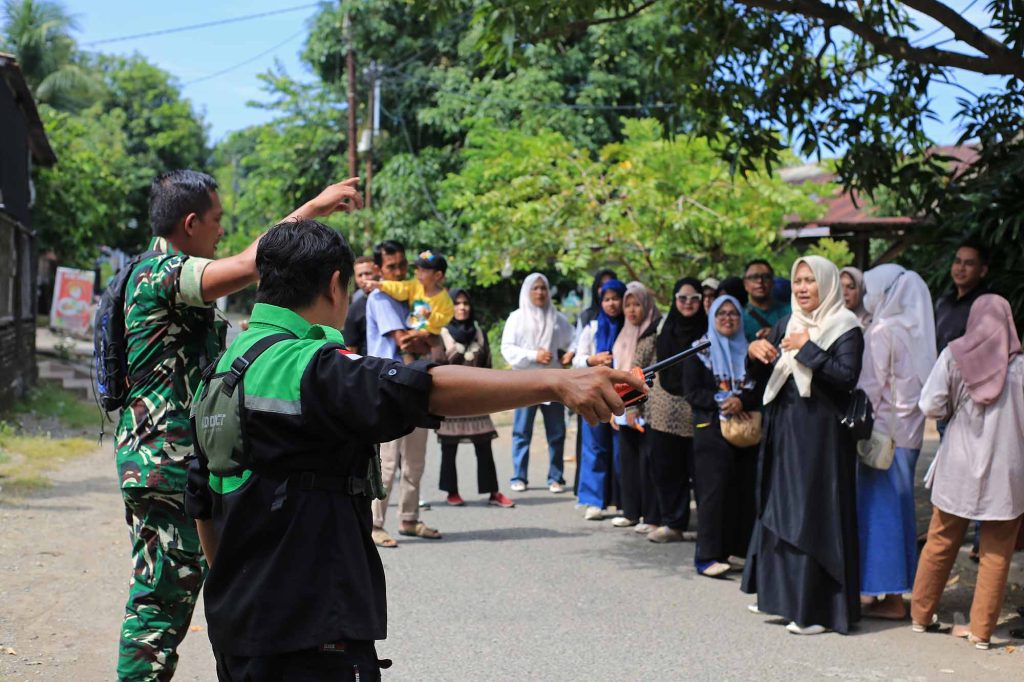 Petugas gabungan mengarahkan warga menuju titik evakuasi saat simulasi mandiri bencana banjir sebagai persiapan yang akan digelar pada puncak peringatan Hari Kesiapsiagaan Bencana (HKB) di Banda Aceh, Sabtu (25/4/2026). Badan Nasional Penanggulangan Bencana (BNPB) menggelar puncak peringatan Hari Kesiapsiagaan Bencana (HKB) pada 26 April 2026 di Banda Aceh sebagai edukasi menuju masyarakat mandiri jika terjadi bencana banjir. Aentenews Foto/Ampelsa.