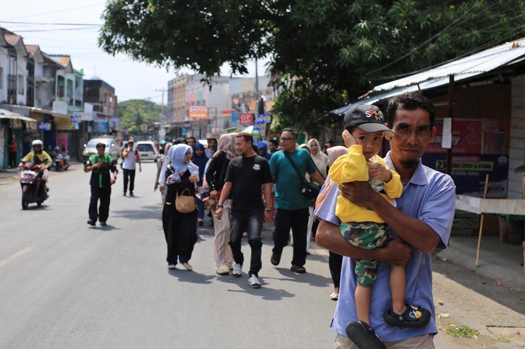 Sejumlah warga mengikuti persiapan simulasi bencana banjir mandiri yang akan digelar pada puncak peringatan Hari Kesiapsiagaan Bencana di Banda Aceh, Sabtu (25/4/2026). Badan Nasional Penanggulangan Bencana (BNPB) menggelar puncak peringatan Hari Kesiapsiagaan Bencana (HKB) pada 26 April 2026 di Banda Aceh sebagai edukasi menuju masyarakat mandiri jika terjadi bencana banjir. Aentenews Foto/Ampelsa.